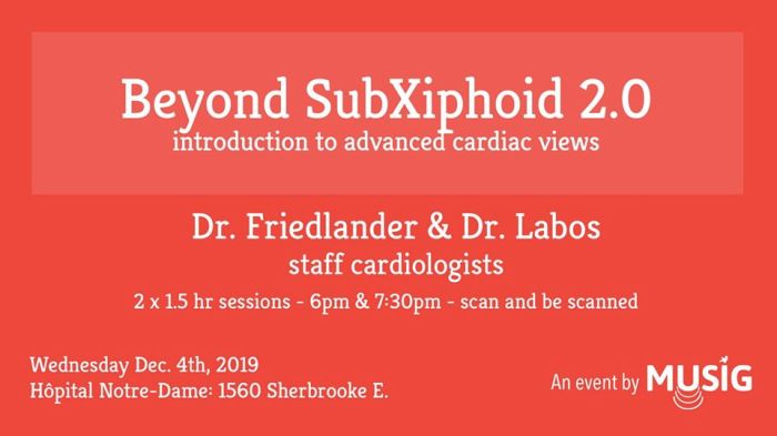 MUSIG is hosting an Advanced Cardiac Echo event in the echocardiography suite at L’Hôpital Notre Dame (1560 Sherbrooke E.) to celebrate the beginning of the month of December. We will be holding 2 sessions with 8 students per each session. The sessions will be lead by staff cardiologists that specialize in echocardiography: Dr. Friedlander and … Continue reading Beyond SubXiphoid