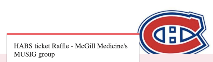 Participate in the raffle for Montreal Canadiens Tickets against Pittsburgh Penguins! All proceeds will go to the McGill Ultrasound Interest Group in medicine! DRAW WILL TAKE PLACE FEBRUARY 1ST AT 12:30PM. Tickets for Game day What: 2 tickets in the 120 red section+ free parking pass When: Saturday March 2nd, 2019 Please send e-transfers to: … Continue reading HABS Raffle Tickets !!